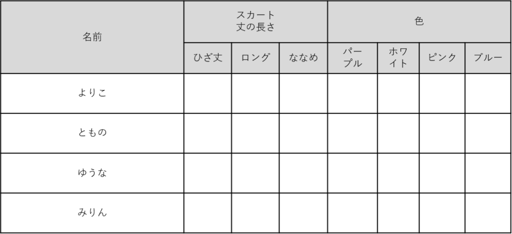 情報を整理して解いてみよう。必要であれば以下の表を余白に移して解いてみよう。