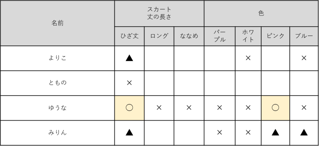 まず、記憶の情報からあてはめられるものを入れてみよう。(○=確定 ▲=どちらか ×=あてはまらない)