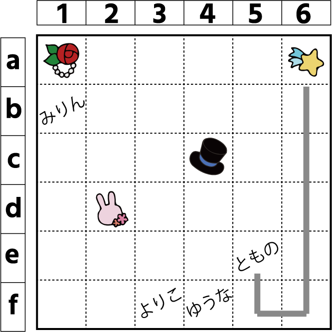 ともののラインは以下のようになる。ゆうなーうさぎ、みりんー帽子を短くつなぐように心がけると繋がるぞ。
